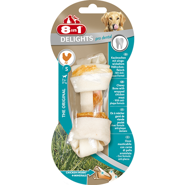 8in1 Delights Pro Dental S zijn kauwbotten gemaakt van heerlijk kippenvlees, gewikkeld in een stevige runderhuid, met extra tandreinigende mineralen - voor gezond kauwplezier, aanbevolen voor honden van 2 kg tot 27 kg. Deze heerlijke combinatie van runderhuid en kip verwijdert tandplak, voorkomt de vorming van tandsteen en zorgt voor een frisse adem. De producten van 8in1 Delights bevredigen het natuurlijke kauwinstinct van honden en trainen hun kaakspieren. Deze botten houden uw hond lekker lang bezig en zorgen voor intensief en langdurig kauwplezier dat bovendien goed is voor zijn tanden: ze moedigen uw hond aan om te blijven kauwen tot hij bij het vlees in het midden is gekomen. Dit product garandeert een langdurige, smakelijke kauwervaring die uw hond tot een uur lang bezig houdt. Het is de perfecte combinatie van kauwplezier en een gezonde hondensnack, ideaal als tussendoortje en tegen de verveling. De botten hebben bovendien een laag vetgehalte en bevatten geen kunstmatige kleurstoffen of smaakversterkers. Houd uw hond tevreden met de kauwbotten van 8in1 Delights Pro Dental.Vlees en dierlijke bijprodukten (Kippenvlees 9%), Mineralen.Ruw eiwit 82,0%, Ruw vet 2,0%, Ruwe celstof 1,0%, Ruwe as 2,0%, Vochtgehalte 14,0%.Tussendoortjes mogen niet meer dan 10% van de dagelijkse calorie-inname van uw hond beslaan. Geschikt voor extra kleine honden (1-<5kg) voer geleidelijk één traktatie binnen een periode van vier dagen. Niet meer dan één traktatie geven binnen een periode