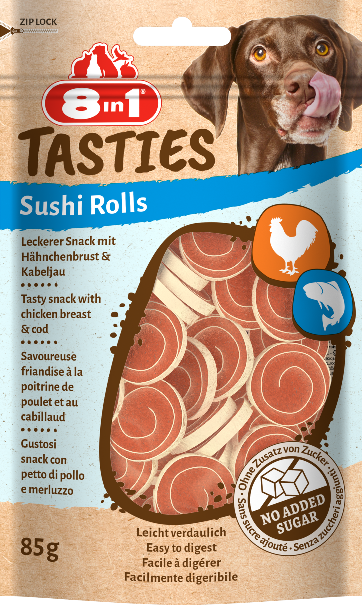 8in1 Sushi Rolls zijn licht verteerbaar, bevatten geen toegevoegde suiker en zijn vetarm. Ze zijn samengesteld zonder smaakversterkers, ggo’s, kunstmatige conserveermiddelen en kleurstoffen. De ovengebakken lekkernijen zijn rijk aan eiwit en bevatten geen gluten. 8in1 Tasties Sushi Rolls zijn een ideale snack voor honden van elke grootte. Laat uw hond genieten van onze lekkere Sushi Rolls!kipfilet (82%), gedroogde erwteneiwitten, kabeljauw (4%), glycerol, ombervis, maïszetmeel, natriumchloride.eiwit 46%, vetgehalte 2%, ruwe celstof 0.5%, ruwe as 4%, vochtgehalte 22%.Snacks mogen niet meer dan 10% van de dagelijkse calorie-inname van uw hond uitmaken.