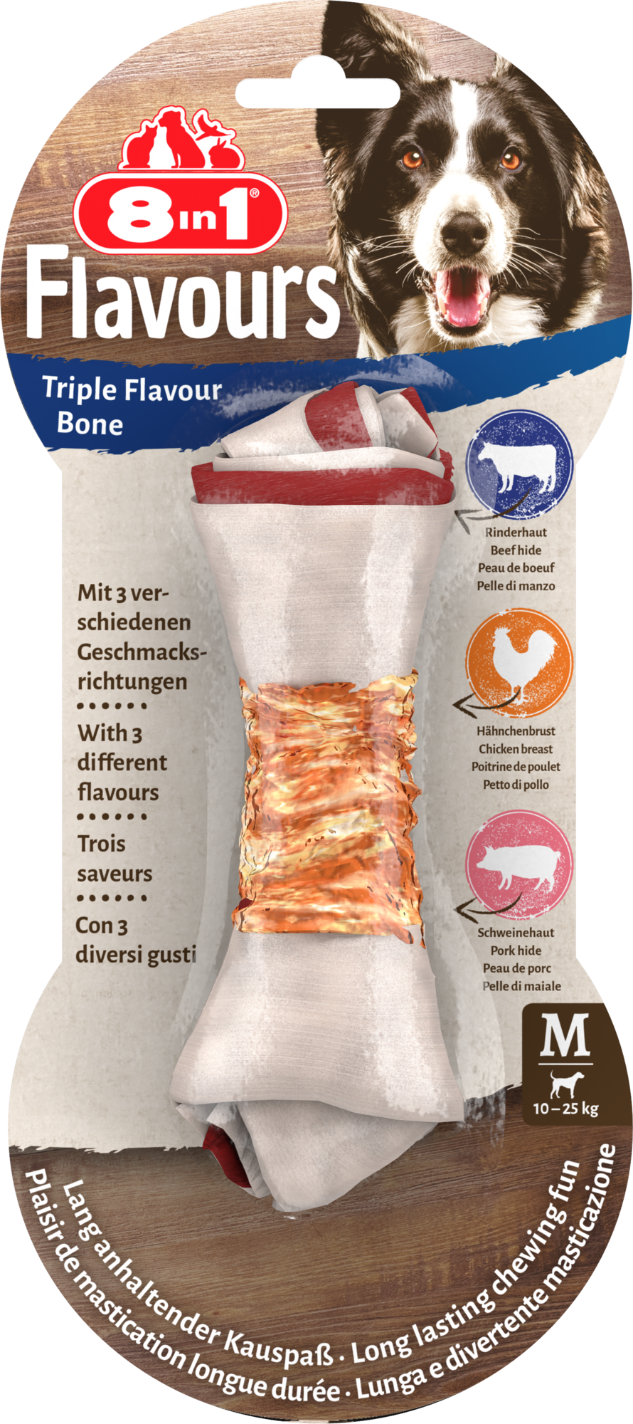 Ons ongelofelijk smakelijke 8in1 Flavours Triple Flavour Bone is gemaakt met stukjes kippenborst, eendenborst en kippenlever om van te watertanden. Dit wordt vergezeld door een unieke combinatie varkenshuid en runderhuid om uw hond die extra smaakervaring te bieden. Dit langdurige kauwbot helpt de opbouw van tandplak en tandsteen onder controle te houden dankzij hun natuurlijk schurende werking tijdens het kauwen. Het is rijk aan eiwit, bevatten weinig vet en geen toegevoegde suikers, smaakverbeteraars of kunstmatige conserveringsmiddelen, waardoor het de ideale beloning of snack zijn voor middelgrote honden. Bovendien bevat het geen ggo's en wordt het in de oven gebakken, waardoor het niet alleen langer meegaat, maar ook alle waardevolle voedingsstoffen behouden worden. Houd uw hond tevreden en bezig met onze 8in1 Triple Flavour Bone. vlees en dierlijke bijproducten (52% runderhuid, 25% varkenshuid, 8% kipfilet), plantaardige bijproducten, mineralen.eiwit 80%, vetgehalte 5%, ruwe as 3.5%, ruwe celstof 1%.Tussendoortjes mogen niet meer dan 10% van de dagelijkse calorie-inname van uw hond beslaan. Geschikt voor middelgrote honden (10-<25kg) voer geleidelijk één traktatie binnen een periode van drie dagen. Niet meer dan één traktatie geven binnen een period