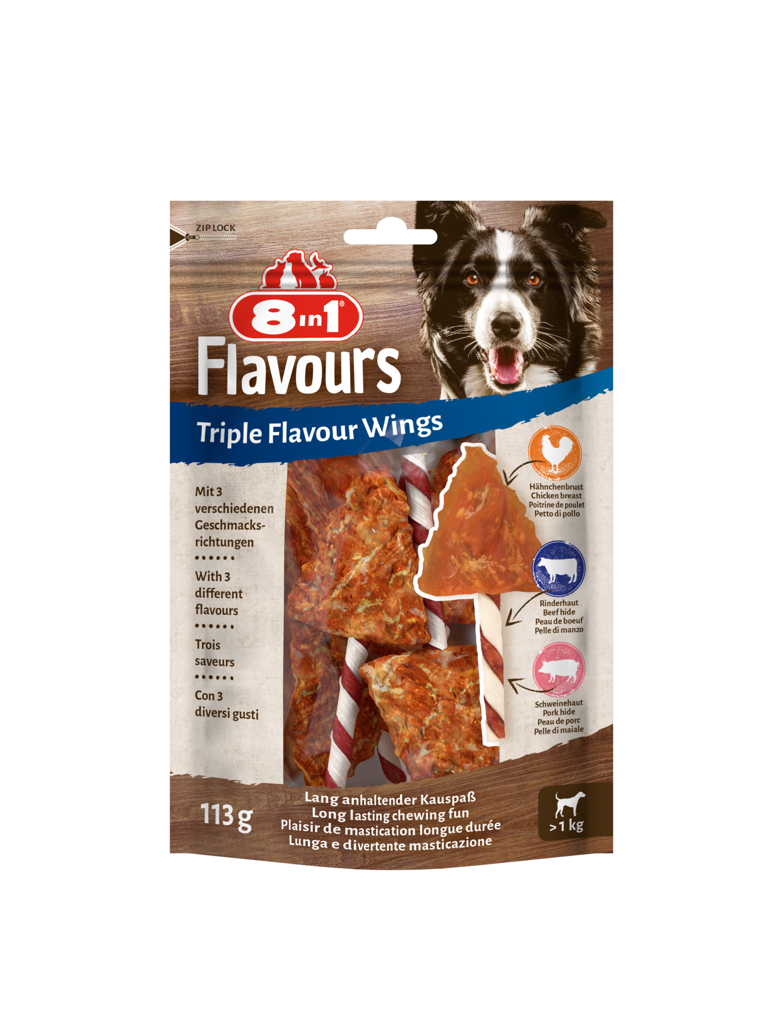 Onze ongelofelijk smakelijke 8in1 Flavours Triple Flavour Wings zijn gemaakt met drie heerlijke smaken varkeshuid en runderhuid , gewikkeld in heerlijke stukjes kippenborst voor die extra smaakervaring te bieden. Deze langdurige kauwspiesjes helpen de opbouw van tandplak en tandsteen onder controle te houden dankzij hun natuurlijk schurende werking tijdens het kauwen. Ze zijn rijk aan eiwit, bevatten weinig vet en geen toegevoegde suikers, smaakverbeteraars of kunstmatige conserveringsmiddelen, waardoor ze de ideale beloning of snack zijn voor honden van alle soorten en maten. Bovendien bevatten ze geen ggo's en worden ze in de oven gebakken, waardoor ze niet alleen langer meegaan, maar ook alle waardevolle voedingsstoffen behouden worden. Houd uw hond tevreden en bezig met onze 8in1 Triple Flavour Wings. vlees en dierlijke bijproducten (48% kipfilet, 20% varkenshuid, 15% runderhuid), plantaardige bijproducten, mineralen.eiwit 68%, vetgehalte 2%, ruwe as 3%, ruwe celstof 1%, vocht 18%.Traktaties mogen niet meer dan 10% van de dagelijkse calorie-inname van uw hond bevatten.