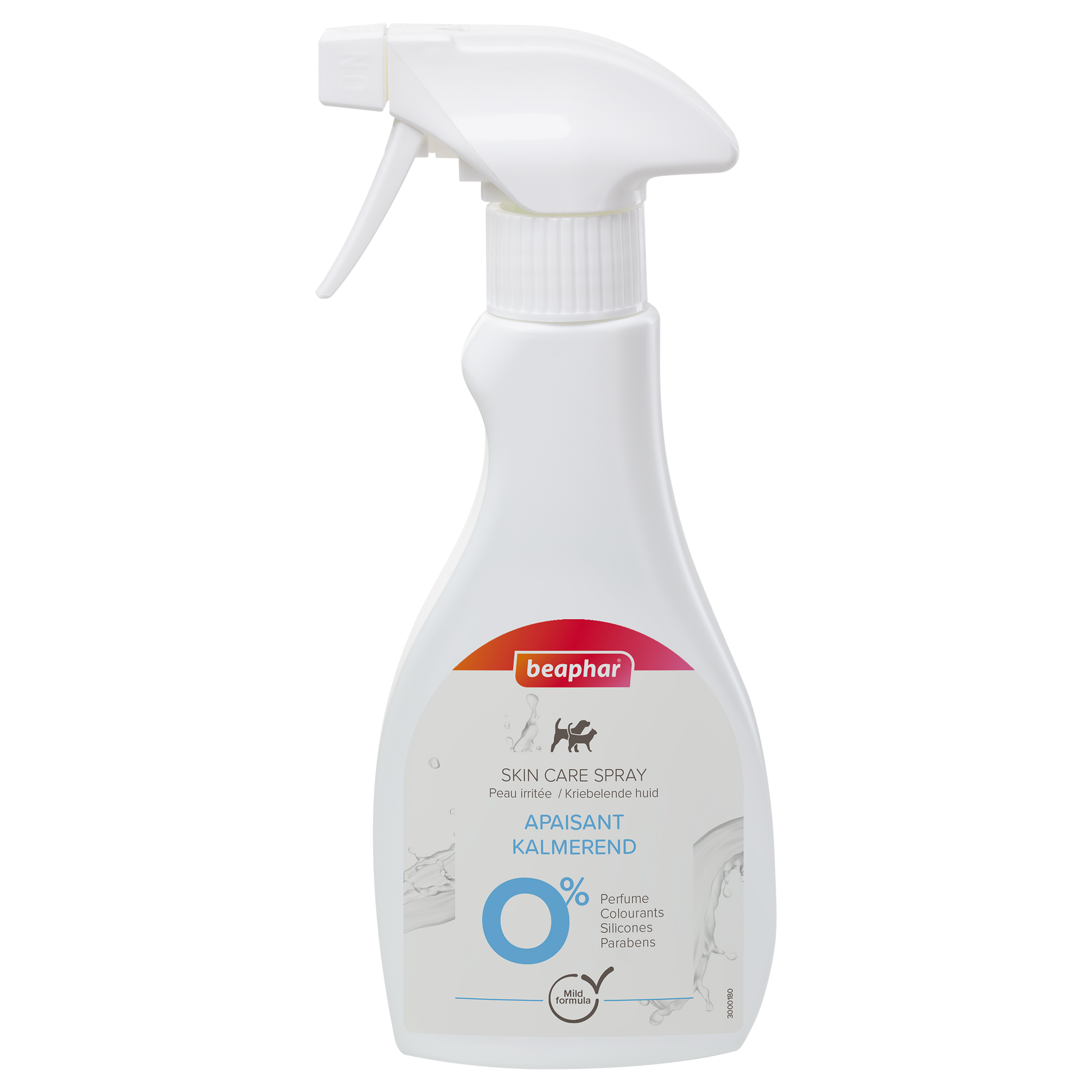 Beaphar Kalmerende Spray is een mild huidverzorgingsproduct ontwikkeld voor honden en katten met een kriebelende huid. Beaphar Kalmerende Spray helpt de huid te kalmeren en het vochtgehalte op peil te houden. Het bevat onder andere aloë vera, glycerine, teunisbloemolie en verkoelende menthol. De spray wordt aanbevolen bij een droge huid en huidirritaties door bijvoorbeeld roos, of om de huid te kalmeren na insectenbeten.AQUA, GLYCERIN, PEG-40 HYDROGENATED CASTOR OIL, ALOE BARBADENSIS EXTRACT, DIMETHYL SULFONE, CETRIMONIUM CHLORIDE, OENOTHERA BIENNIS OIL, MENTHOL, PROPYLENE GLYCOL, SODIUM HYDROXIDE, 5-BROMO-5-NITRO-1.3-DIOXANEGoed schudden voor gebruik. Spray tegen de haarrichting in vanaf 20-30 cm afstand en vervolgens goed inmasseren. Uitwassen is niet nodig. Gebruik eenmaal per dag. Bij een zeer ruwe of gevoelige huid is aanbevolen dit product twee keer per dag te gebruiken