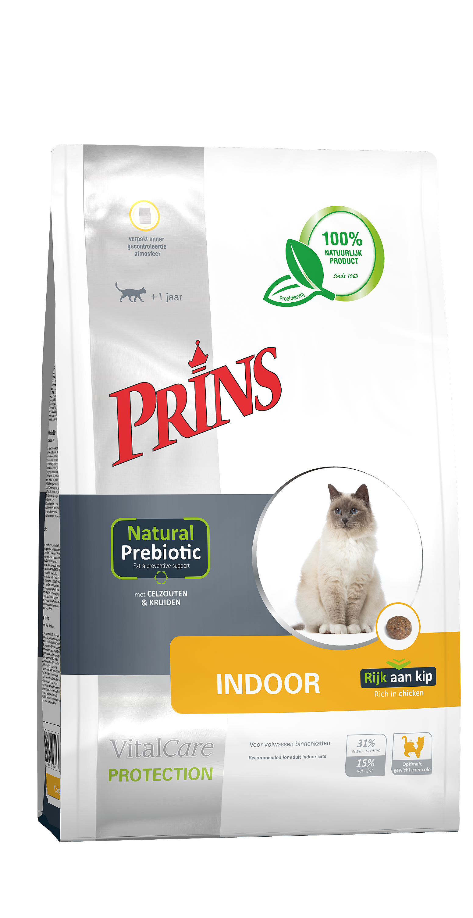 Prins VitalCare Protection Indoor is een voeding speciaal voor volwassen binnenkatten. Deze voeding is verrijkt met kruidenextracten & Schüssler celzouten voor de juiste ondersteuning van uw kat, is rijk aan kip en bevat hoogwaardige voedingsvezels die bijdragen aan een gezonde darmflora. De voeding bevat speciale mineralen (hexametafosfaat) die de vorming van tandplaque helpen te verminderen.SAMENSTELLING: gedehydreerde kip (27%), maïs, rijst, dierlijke vetten (gevogelte), verse kip (5%), cellulose, gehydrolyseerde kippenlever, maïsgluten, eipoeder, erwten, gist, bietenpulp, gedroogde chicorei (een natuurlijk bron van FOS en inuline), gedroogd Antarctisch krill (een natuurlijke bron van EPA en DHA) (0.5%), zalmolie (0.5%), Aspergillus meel (een natuurlijke bron van FOS, GOS en MOS) (0.5%), lecithine, kruidenextracten & Schüssler celzouten (dioscorea, polygonatum, morus fruit, cornu cervi deglatinatum, psoralea, cnidium, cyperus, gallus, scrophularia, Schüssler celzouten nr. 4, 7, 8, 9 en 11) (0.075%), cranberries. ANALYSE: Vocht 8.0%, Ruw eiwit 31.0%, Ruw vet 15.0%, Ruwe as 6.5%, Ruwe celstof 5.5%.