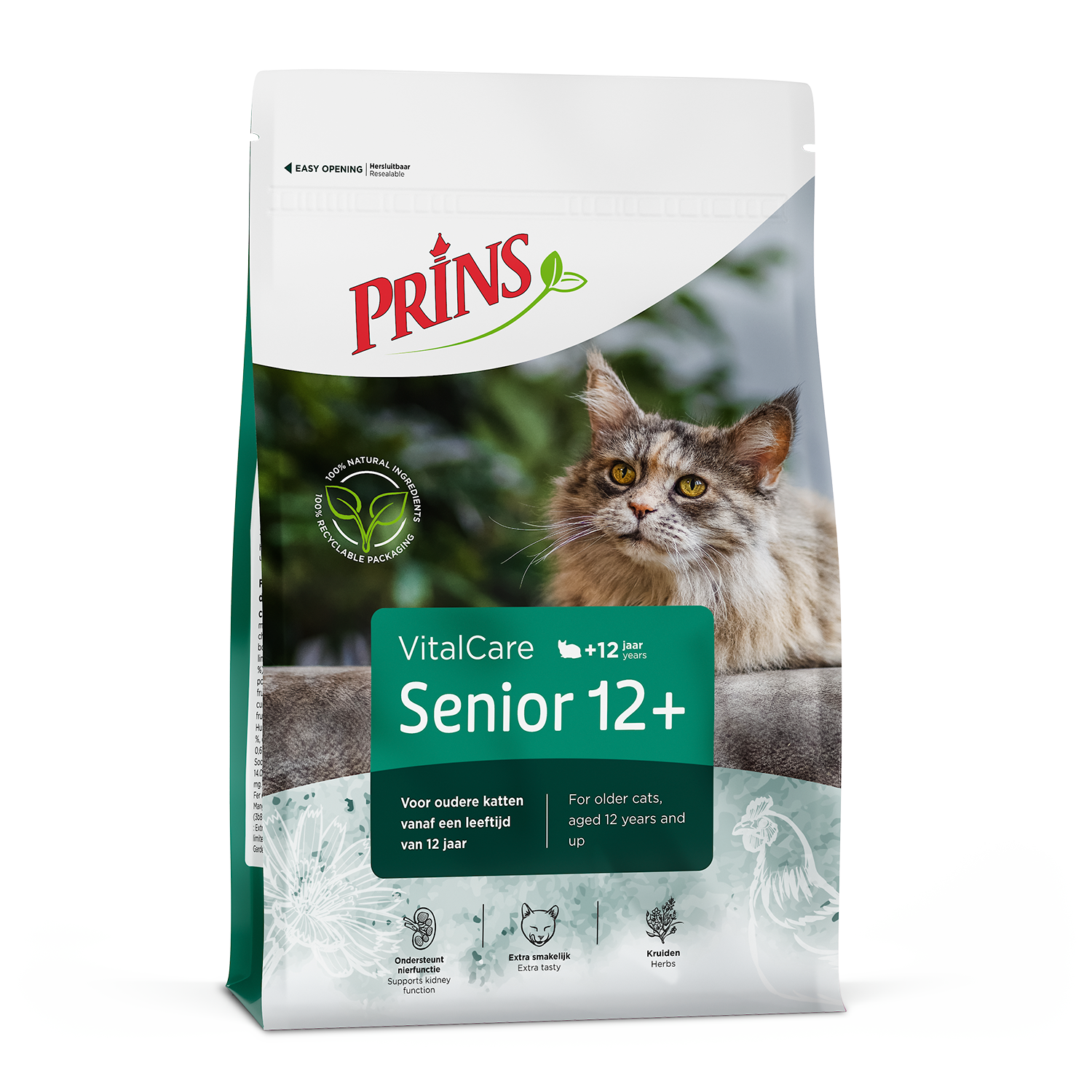VitalCare Senior 12+ is een krokante voeding geschikt voor katten met een leeftijd vanaf ca. 12 jaar. Deze voeding bevat een verhoogd energiegehalte wat bijdraagt aan het behoud van een gezond gewicht. Oudere katten kunnen te maken hebben met een verminderde eetlust. De zorgvuldig geselecteerde ingrediënten zorgen voor een smakelijk voeding en stimuleren de eetlust van de oudere kat. Daarnaast helpt een kleinere brokvorm de oudere kat gemakkelijk de voeding op te nemen en te kauwen. Deze volledige voeding sluit aan bij de veranderende voedingsbehoefte van de oudere kat en ondersteunt het immuunsysteem en de gewrichten. mai?s, rijst, mai?sgluten, gedehydreerd gevogelte (14,0%), dierlijk eiwitextract, gevogeltevet, gedroogde cichoreipulp, cellulose, heel eipoeder (2,0%), rundvet, visolie (1,5%), kippenleverhydrolysaat, lijnzaadolie, gist, gistextract (bron van be?ta-glucanen) (0,05%), resist kruiden (eleutherococci radix, lycii chinense fructus, polygoni multiflori rad, ganodermatis fructificat, schizandrae fructus, acanthopanacis radicis c, dipsaci radix, cuscutae semen, curculiginis rhizoma, dioscoreae oppositae rh) (0,05%), fructo-oligosaccharide (FOS).Vocht 8,0%, Ruw eiwit 30,0%, Ruw vet 17,0%, Ruwe as 5,0%, Ruwe celstof 3,5%.