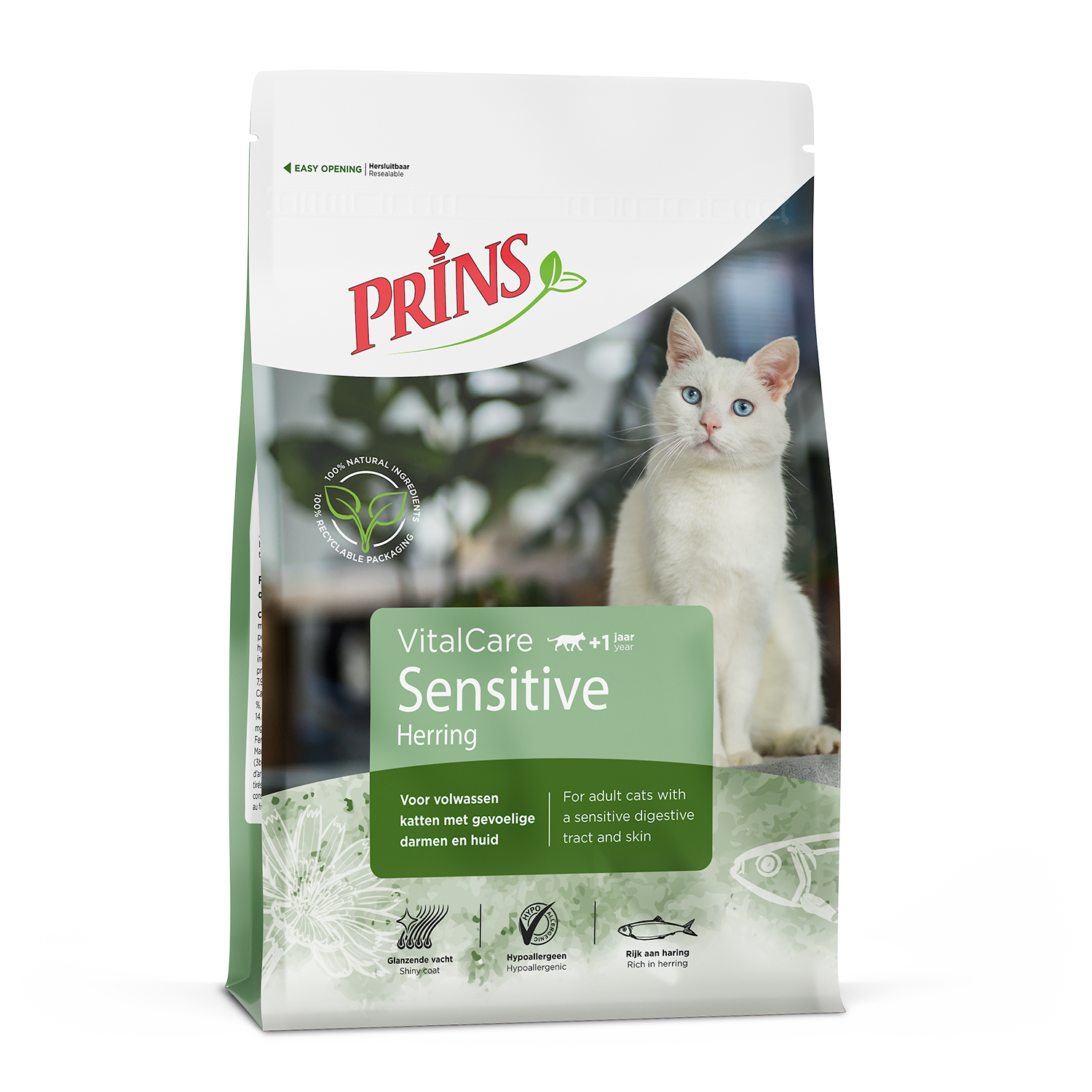 VitalCare Sensitive Hypoallergic is een hoogwaardige voeding speciaal voor katten met een gevoelige spijsvertering. Deze voeding bevat één geselecteerde eiwitbron vis (haring), wat de kans op een overgevoeligheidsreactie vermindert. De toevoeging van omega-3 vetzuren dragen bij aan een verbeterde conditie van de gevoelige huid en zorgen voor een glanzende vacht. SAMENSTELLING: mai?s, gedehydreerde haring (26%), mai?sgluten, dierlijk vet (gevogelte, rund), rijst, gedroogde bietenpulp, gehydrolyseerde kippenlever, cellulose, zalmolie, gist, inuline (bron van FOS) (0.5%), mineralen, fructooligosaccharide (FOS) en plantenextracten.ANALYSE, Vocht 8,0%, Ruw eiwit 31,5%, Ruw vet 20,0%, Ruwe as 7,5%, Ruwe celstof 3,5%