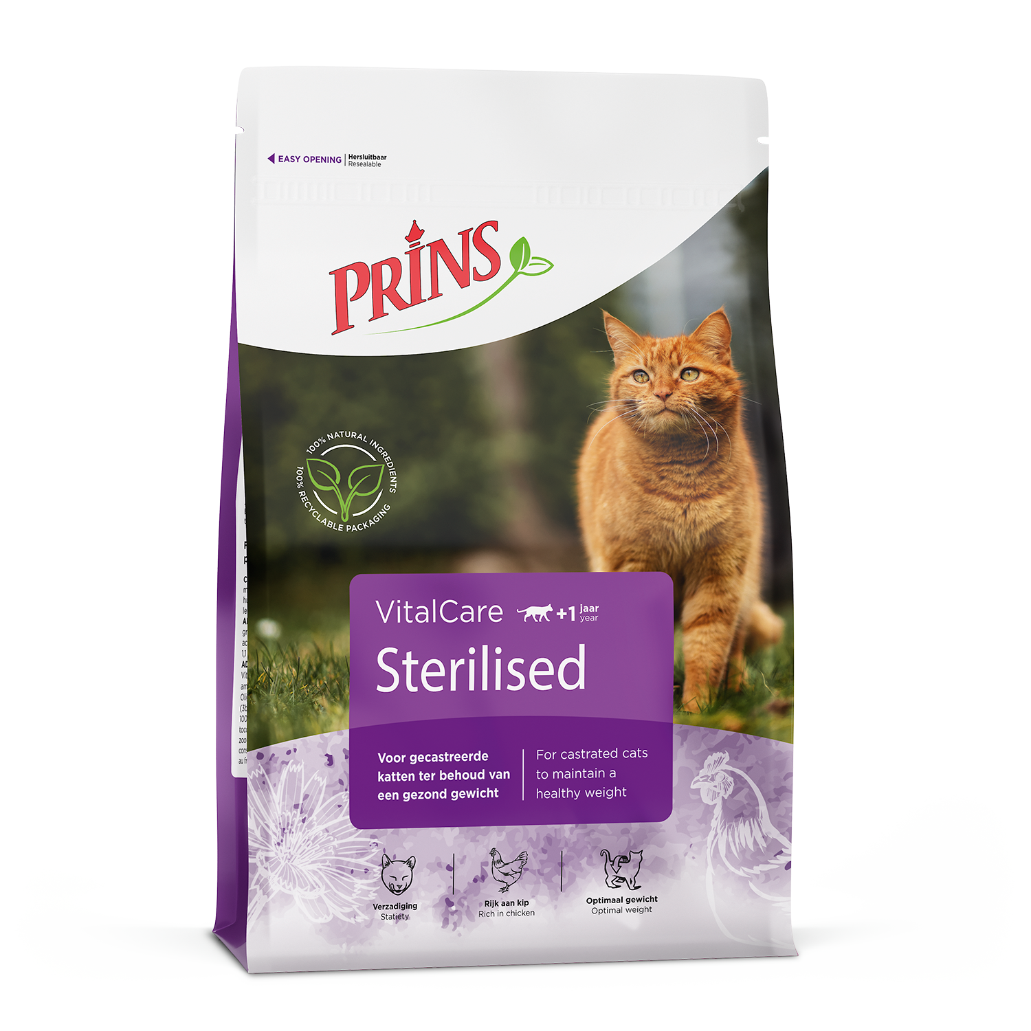 VitalCare Sterilised is speciaal geschikt voor gesteriliseerde en gecastreerde katten. Extra voedingsvezels in de voeding zorgen voor een verzadigd gevoel en helpen de kat een gezond gewicht te behouden.gedehydreerd gevogelte (34,0%), mai?s, mai?sgluten, rijst, cellulose, gedroogde cichoreipulp, heel eipoeder, visolie, gehydrolyseerde kippenlever, gevogeltevet, gist, fructo-oligosachariden (FOS). Vocht 9,0%, Ruw eiwit 35,0%, Ruw vet 12,0%, Ruwe as 8,0%, Ruwe celstof 6,5%, Linolzuur 2,3%.
