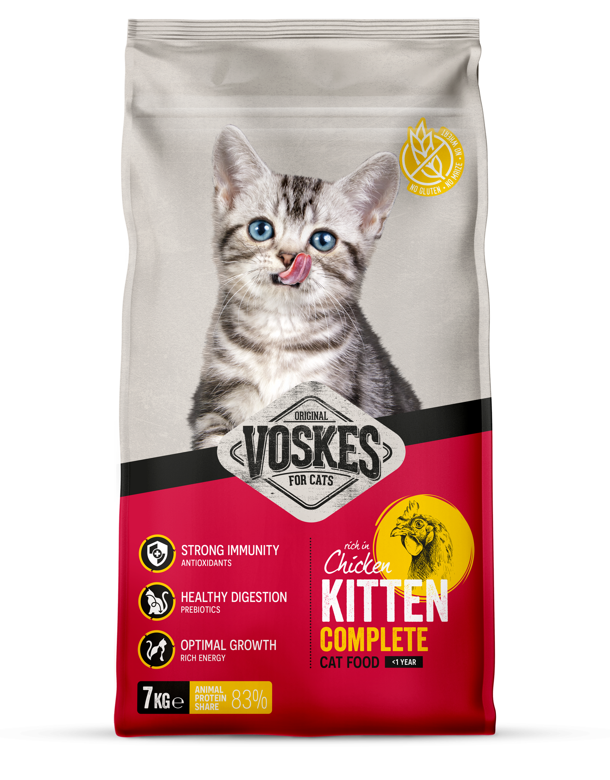 Volledig diervoeder voor kittens. Een optimale groei wordt ondersteund door deze energierijke voeding. Kip als belangrijkste eiwitbron, helpt samen met vitaminen en mineralen bij de ontwikkeling van sterke tanden, botten en spieren. Klinische studies tonen aan dat de vorming van tandplak en tandsteen worden verminderd door de toegevoegde gefosforyleerde vitamine C. Een goede weerstand en een gezonde spijsvertering worden ondersteund door toevoeging van een unieke blend van gedroogde planten - van nature rijk aan antioxidanten - aangevuld met prebiotica en ?-glucanen. Visolie bevordert een gezonde huid en vacht. Samengesteld zonder maïs of tarwe. VOSKES Kitten – Chicken is ook geschikt voor drachtige en zogende poezen.gedroogde kip (40%), rijst, dierlijk vet, erwten, bietenpulp, gehydrolyseerd kippeneiwit, mineralen, biergist, visolie, G.O.S., M.O.S., F.O.S., ?-glucanen, gedroogde planten (Rosmarinus sp., Curcuma sp., Eugenia sp.)35% ruw eiwit; 21% ruw vet; 1,8% ruwe celstof; 7,2% ruwe as; 1,45% calium; 1,1% fosforZorg voor een geleidelijke overgang wanneer u een nieuwe voeding geeft. Volg de richtlijnen van de voedingstabel. Zorg dat er altijd vers drinkwater beschikbaar is. Koel en droog bewaren. Na opening de zak goed sluiten na elk gebruik. Houd de zak buiten h