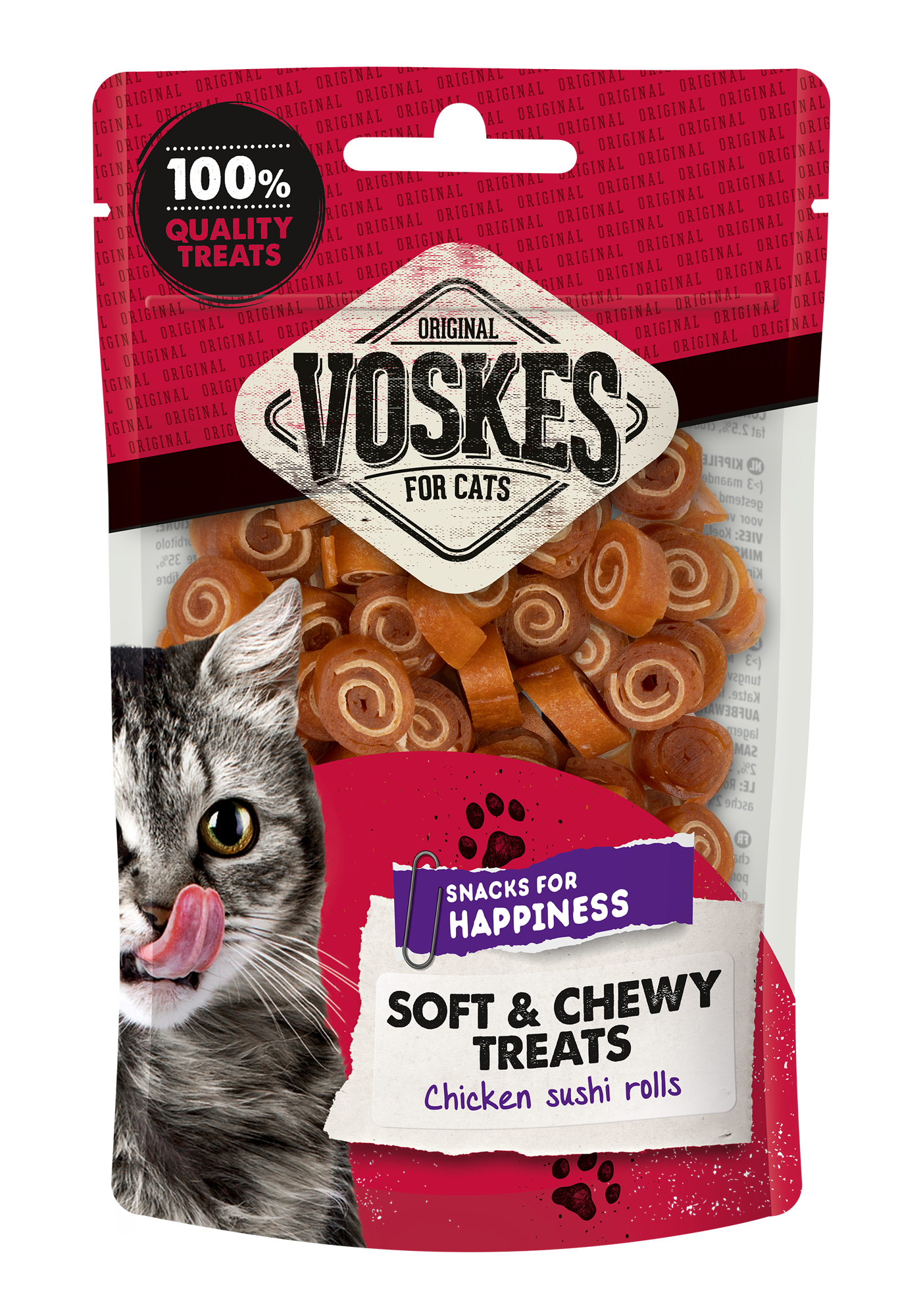 Deze beloningsnacks op basis van kip zijn een ware traktatie voor katten. Heerlijke kipfilet verrijkt met kabeljauw in een mooie sushivorm. Geschikt voor opgroeiende kittens en volwassen katten.Kip 61%, kabeljauw 17%, tapiocazetmeel 8,9%, glycerine 6%, plantaardige eiwitten 5%, sorbitol 2%, zout 0,1%.Geef verantwoord, afgestemd op het gewicht en inspanning van uw kat. Zorg altijd voor voldoende vers drinkwater voor je kat. BEWAARADVIES: koel, droog en indien mogelijk donker bewaren.